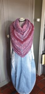 De omslagdoek kwam ook af van de week. Wel twijfel ik of ik er nog een rand omheen zal haken.Ben er nog niet over uit. Nu staat hij op de paspop in de kamer. Er werd al gevraagd of ik dat stomme ding niet weg kon halen omdat ze elke keer denken als ze binnenkomen dat ik er sta.?