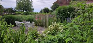 Maar zo slecht al het vlas ervoor staat, zo mooi staat de rest van de tuin erbij. Daar is het echt een oppepper voor geweest al die regen. Hier een paar foto’s van leuke doorkijkhoekjes in de tuin.