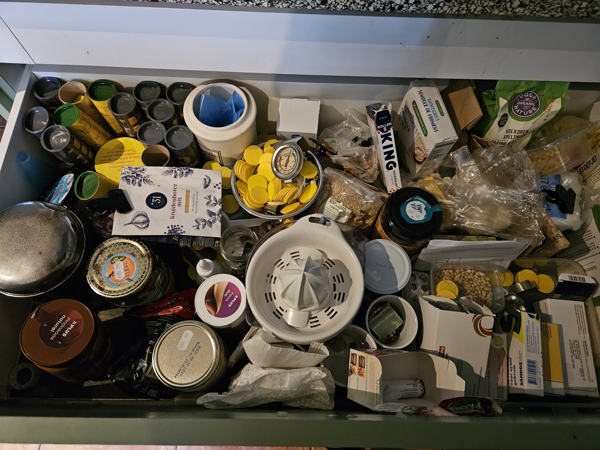 Ik heb me toch een lijst met klussen liggen die in de vakantie moeten gebeuren. Echt, het is hoogtijd dat ik eens grondig door de kasten en het huis ga. Door de drukte veel blijven liggen. Ik ben dringend op zoek naar een huishoudelijke hulp voor elke week, eentje die zelfstandig kan werken, dus als jullie iemand weten!! Maar ik heb van de week vast een begin gemaakt hoor, een la in de keuken was het 1e aan de beurt. Een zwijnenstal. Heel veel losse muntjes van de kaasboer op de markt, die heeft Hidde even voor me zitten tellen. 15 kokertjes met 50 muntjes vol. Maar na een half uurtje herkende je de la niet meer terug. Zie je wel: wat je aanpakt valt mee, wat je uitstelt weegt zwaar. Tegeltjes wijsheid van m’n mams. En vandaag had ik 2 kilo kaas gratis op de markt tegen ruil van de muntjes. Toch niet voor niks gespaard.