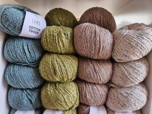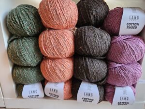 Er komen verschillende technieken in deze trui aan de orde, een leuke uitdaging. Aan de hand van een proeflapje gaan we vaststellen hoeveel steken jij nodig hebt om een passende trui te maken. Maar denk ook aan het rondbreien op de rondbreinaald, het gebruik van verkorte toeren en verschillende soorten meerderingen voor de raglan mouwinzet. Uiteraard worden de technieken goed uitgelegd. Je kiest 3 weken van te voren je kleurtje katoen uit op de website. Hieronder staat al wat kleuren die worden met een week uitgebreid met nog 4 kleurtjes. Die bestel ik dan voor je. De gekozen kleur kan helaas niet omgeruild worden voor een ander als je de 1e les komt anders zit ik weer met een overschot.