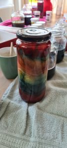 Donderdag was de dag gevuld. s’Morgens kwamen twee dames op cursus wol verven. Voor de zekerheid had ik de kinderen op school laten eten want het zou er om hangen of we op tijd klaar waren. En maar goed dat ze op school aten want het was kwart over 1 toen ze vertrokken. Soms loopt het wel eens uit, maar dat geeft niet. De dames waren blij met hun geverfde kluwen wol en hopen in juni op spinles te komen.