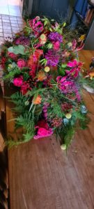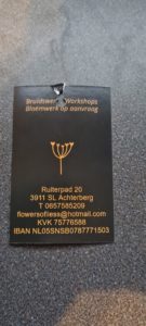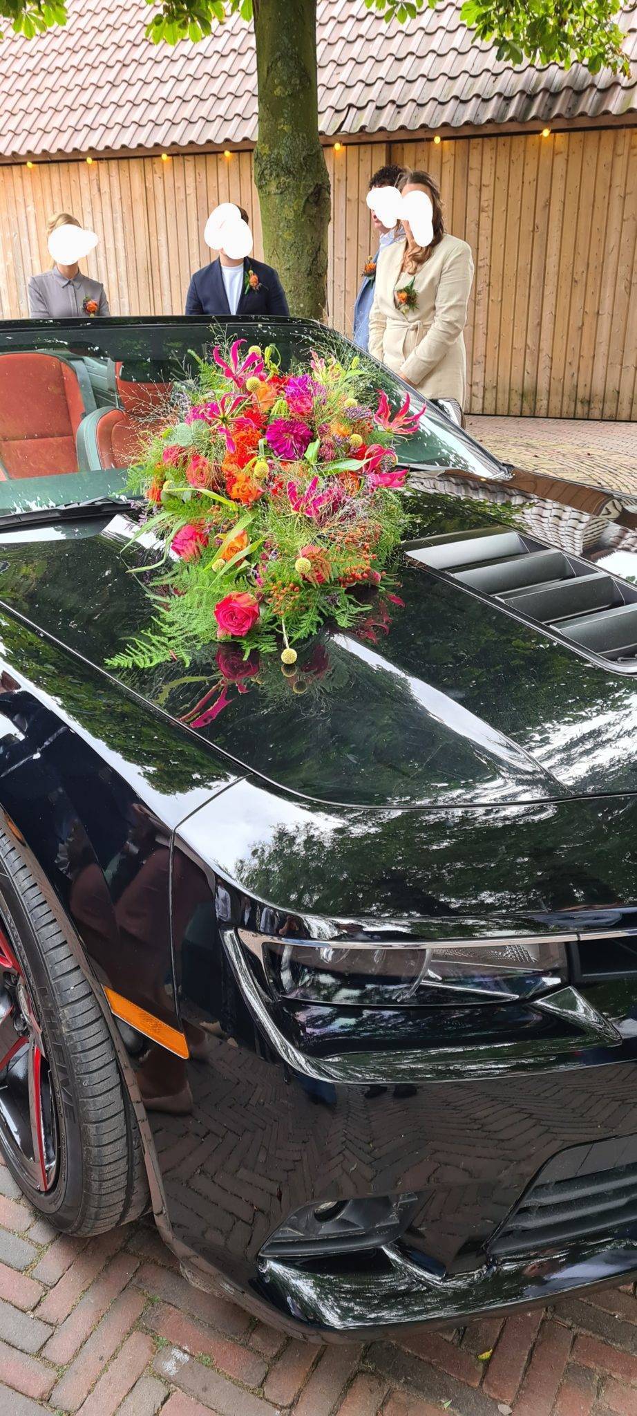 De bloemist uit het dorp kwam het bruidsboeket, de corsages en het bloemstuk voor op de auto vast thuis bezorgen, hoefde Rien dat niet op te halen op de trouwdag. Wat was dat mooi gemaakt, heb zelden zo’n mooi bloemwerk gezien. Toen onze schoondochter voor het boeket uitzoeken naar haar toeging, was ze heel duidelijk in haar smaak. Maakte niet zoveel uit wat voor boeket het was, als er maar vooral veel kleur in zat. Nou, dat heeft ze wel waar gemaakt. Ik kan haar van harte aanbevelen voor je bruidswerk, wat een vakvrouw!