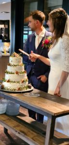 Daarna reden we opnieuw naar de Oude Duikenburg. Bij aankomst een stuk verrukkelijke bruidstaart op, en zo mooi om te zien. Van bakker Huibers uit Achterberg/Kesteren