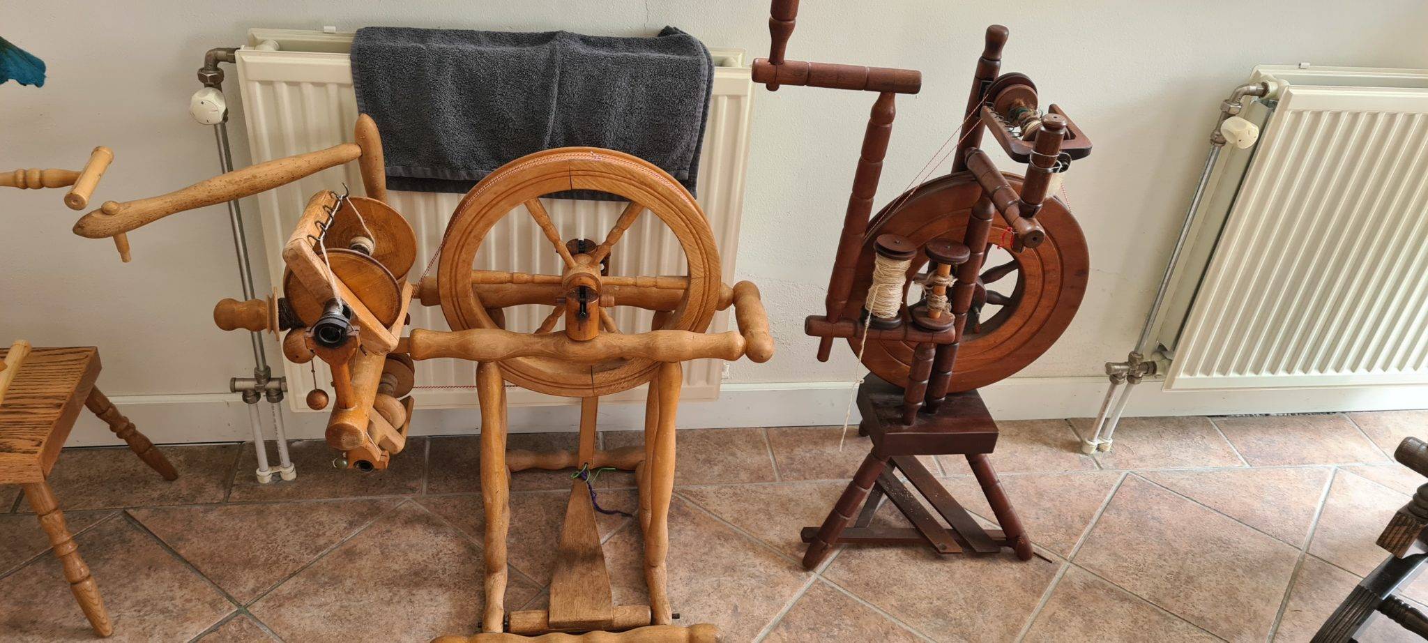 Er werd door een schooljuf gevraagd of ik de oude spinnewielen uit de kelder weer op gang kon helpen, dat kregen ze niet voor elkaar. Een schippertje en een zuid- Duits spinnenwiel. Na een nieuw touw erop gezet te hebben en een poosje prutsen liepen ze weer als een trein.