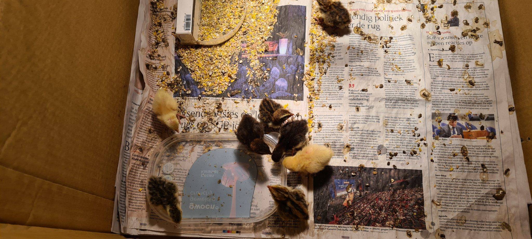 Hidde had een paar weken terug kwarteleitjes gekocht voor in de broedmachine. Zondag zijn ze uitgekomen. Wat een grappige beestjes zijn dat toch. Ze zijn als ze uit het ei komen niet groter dan 4 cm, maar snel dat ze zijn. Ik wil er wel een paar van hem kopen, want die eitjes zijn zo lekker en staan zo grappig in de sla. Je hoeft ze ook maar 2 minuten te koken omdat ze zo klein zijn.