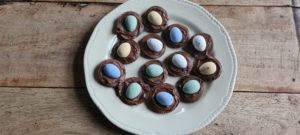 Maakte daar gelijk achteraan een stel chocoladenestjes. Bij gebrek aan kleine eitjes moesten er maar grote paaseieren op, stond ook wel een keer mooi. Het maken is zo simpel als wat. Chocola smelten in een pannetje, dan doe je een eetlepel gesmolten chocola in een muffinvormpje, eitje erop en als de chocola bijna hard is geworden dan roer je er even met een vork door zodat er wat strepen in de chocola komen.