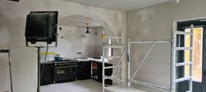 Deze week zou dan het meest vieze klusje van de verbouwing gaan gebeuren. De stukadoor ging aan de slag. Maandag heeft Rien, samen met Rien jr en Michiel de laatste grote spullen uit de keuken gesjouwd, alles afgeplakt en in de voorstrijk gezet.