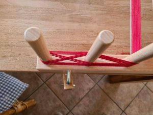 Toen het bloemstuk klaar was en de rommel aan de kant heb ik eerst weer een poging gedaan om een proefschering op te zetten op het weefgetouw. Ik heb werkelijk altijd ruzie met dan ding. Zo vaak geprobeerd en elke keer deed ik wel weer wat fout. Daar was ik zo klaar mee dat ik me had voorgenomen om het werk te laten liggen en net zolang gaan oefenen totdat hij goed op het weefgetouw stond. En warempel het is me eindelijk gelukt. Bij mij ging het elke keer mis met het maken van het evenaarskruis in de schering.