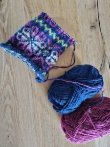 Ik ging voor een lapje als binnenvoering voor een etui die ik aan het breien ben in fair isle. Dat lijkt me een handig iets om al m’n rondbreinaalden in op te bergen, en het is een sieraad op de tafel in het atelier.