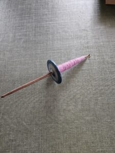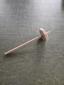 Tollen met de schijf in het midden, ideaal voor in de auto, leg je op je schoot en draai je met de hand, de andere hand trekt de wol uit de pluk. Kun je overigens ook gewoon hangend mee spinnen.