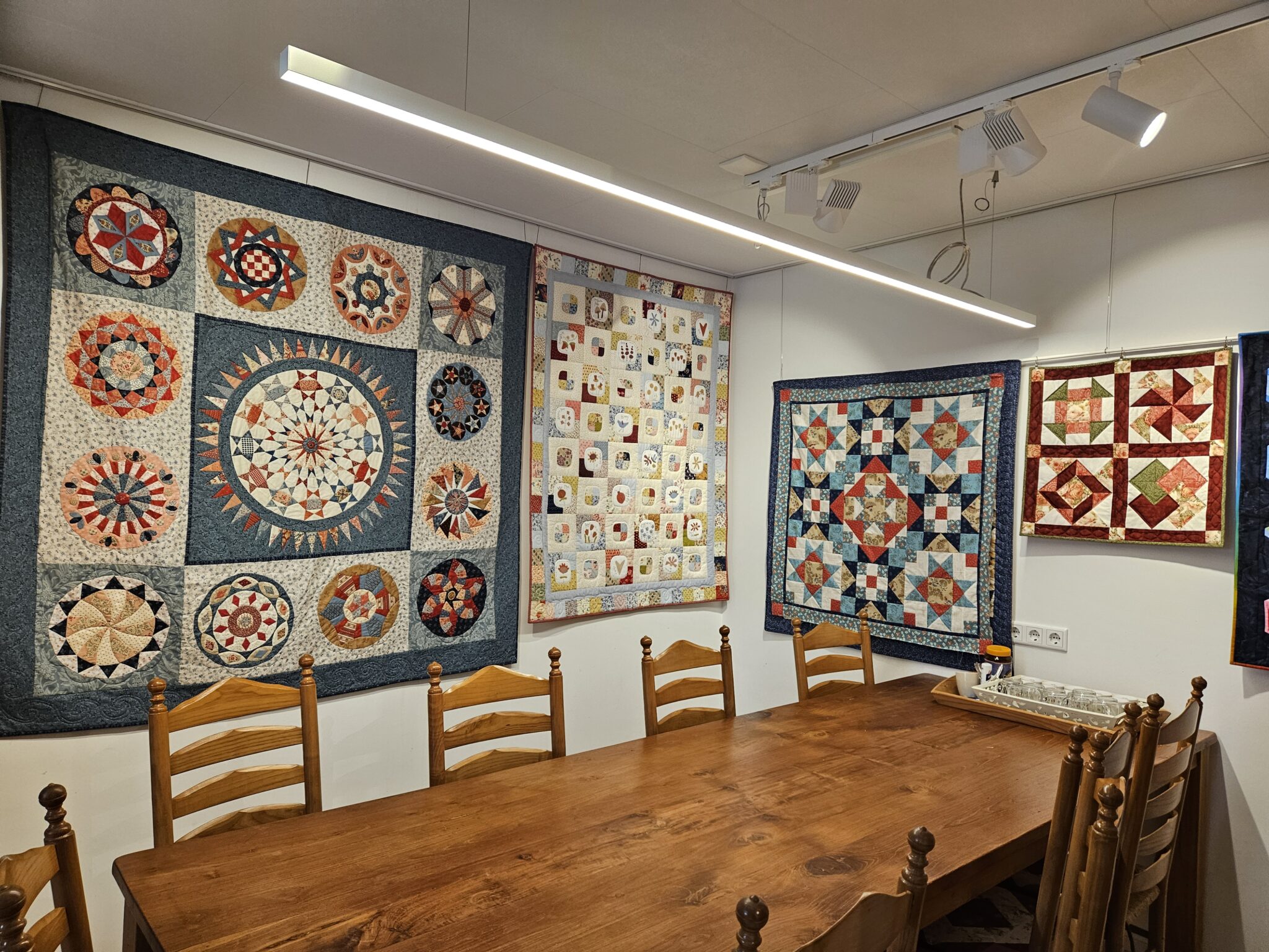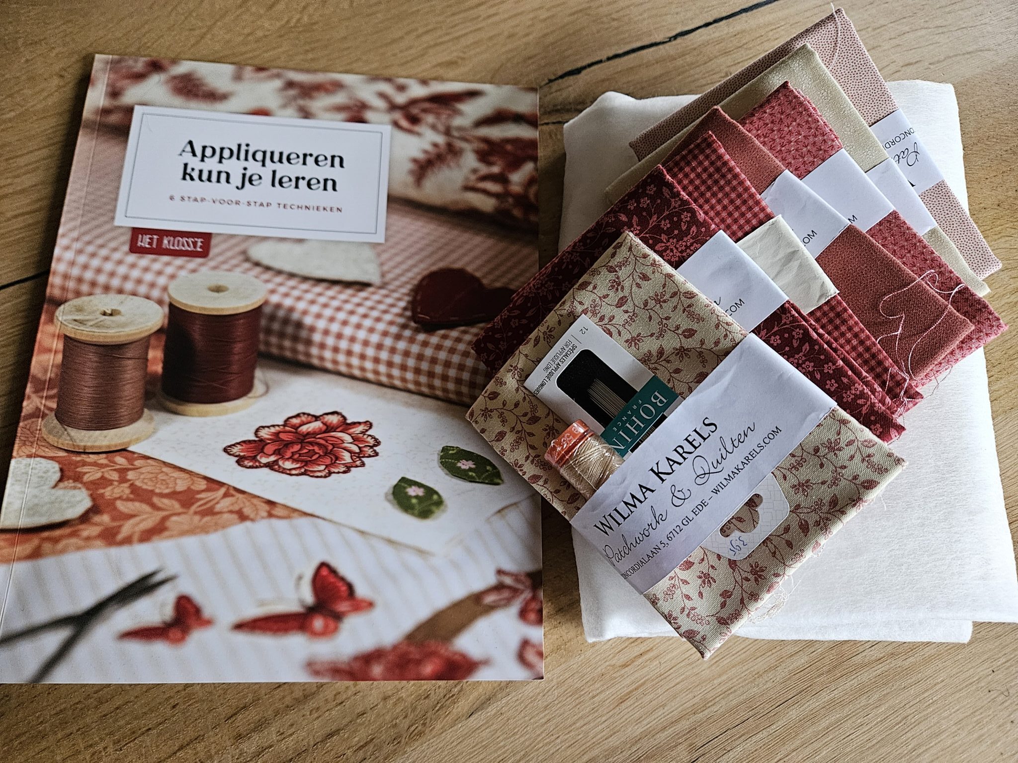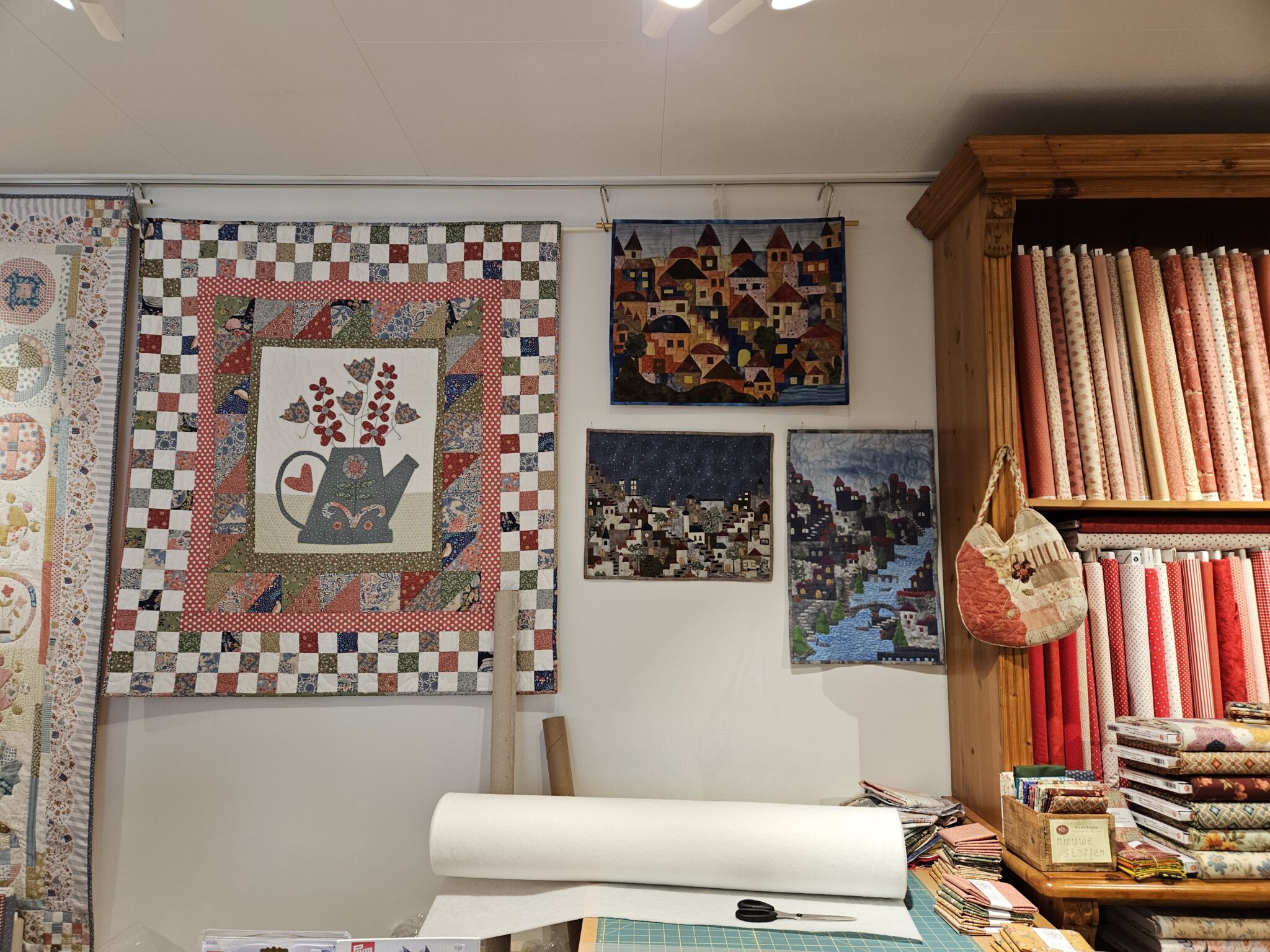Toen ik daar in de winkel liep zag ik zulke prachtige quilten hangen dat je zin krijgt om er aan te beginnen. Heb mezelf streng vermaant want ik heb er nog een liggen die af moet. Hoelang al? Nou………ongeveer 4 jaar🙈. Vast herkenbaar voor veel mensen. Ik heb een goed excuus…..wist niet dat ik zo’n druk leven zou krijgen met het atelier en de winkel. Maar aan de andere kant: kon het toch niet laten om bij Wilma een paar lapjes mee te nemen om een schilderijtje te maken met appliceren. Hoezo goed excuus? Moet gewoon eerlijk toegeven dat ik wel 6 projecten heb liggen waar ik mee bezig ben en gerust daarbovenop nog een project start. Maar afkomen doen ze. Hoe noemen ze dat woord ook al weer? Verslaving……of beetje gestoord:-) Gelukkig krijg ik dat probleem wekelijks te horen in de winkel, ben dus niet de enigste. Pfffffff, wat een opluchting!!