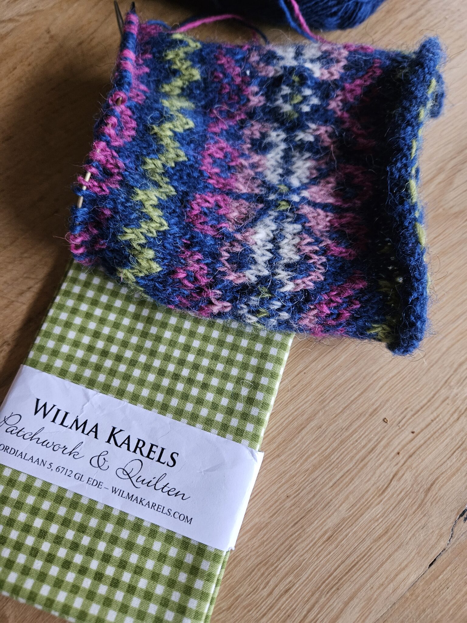 Ik ging voor een lapje als binnenvoering voor een etui die ik aan het breien ben in fair isle. Dat lijkt me een handig iets om al m’n rondbreinaalden in op te bergen, en het is een sieraad op de tafel in het atelier.