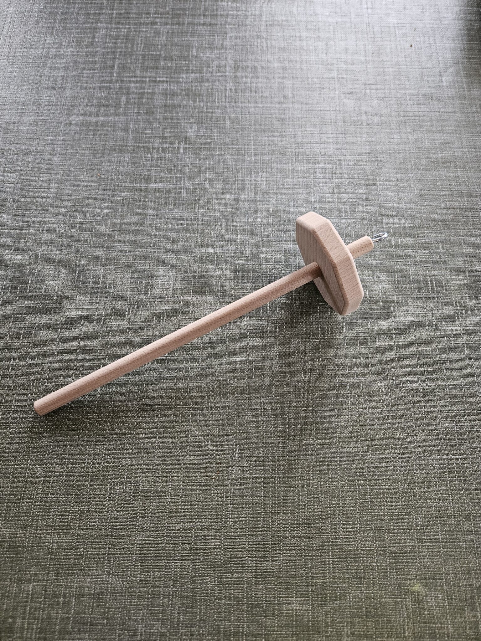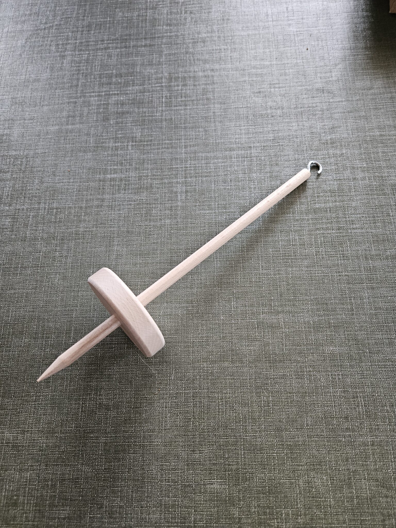 Tollen met de schijf in het midden, ideaal voor in de auto, leg je op je schoot en draai je met de hand, de andere hand trekt de wol uit de pluk. Kun je overigens ook gewoon hangend mee spinnen.