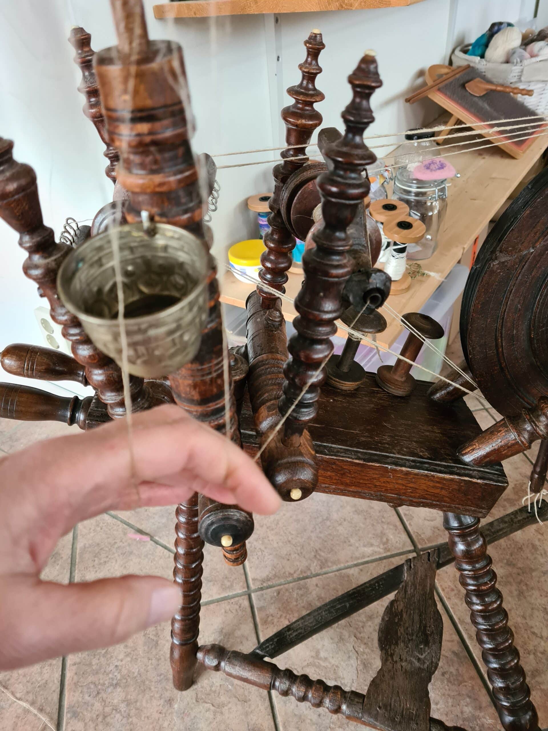 Woensdag was de vaste oppasdag van de kleine Noa. Tis toch zo’n lekker moppie. Ze is nu bijna 7 maanden en kan d’r eigen steeds meer zelf vermaken in de box. Geniet er echt van. s’Morgens kreeg ik bezoek van Erna Evers en haar man. Bij haar heb ik vlas leren spinnen en een tijdje terug belde ze me op dat ze een prachtig antiek dubbelkops spinnewiel voor me te koop had. Dat is een spinnewiel waar twee spoelen op zitten en in het midden een vlasrok. Zo kun je dus twee spoelen tegelijk vol spinnen. Je spint dan met twee handen het vlas uit de vlasrok. Een gaat op de linker spoel en de ander op de rechter. Nou ik moet eerlijk zeggen dat dat toch wel enige oefening vergt. Maar wat een prachtig wiel, ben er zeer mee in m’n sas! Hij (of zij) is meer dan honderd jaar oud.
