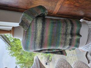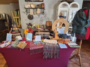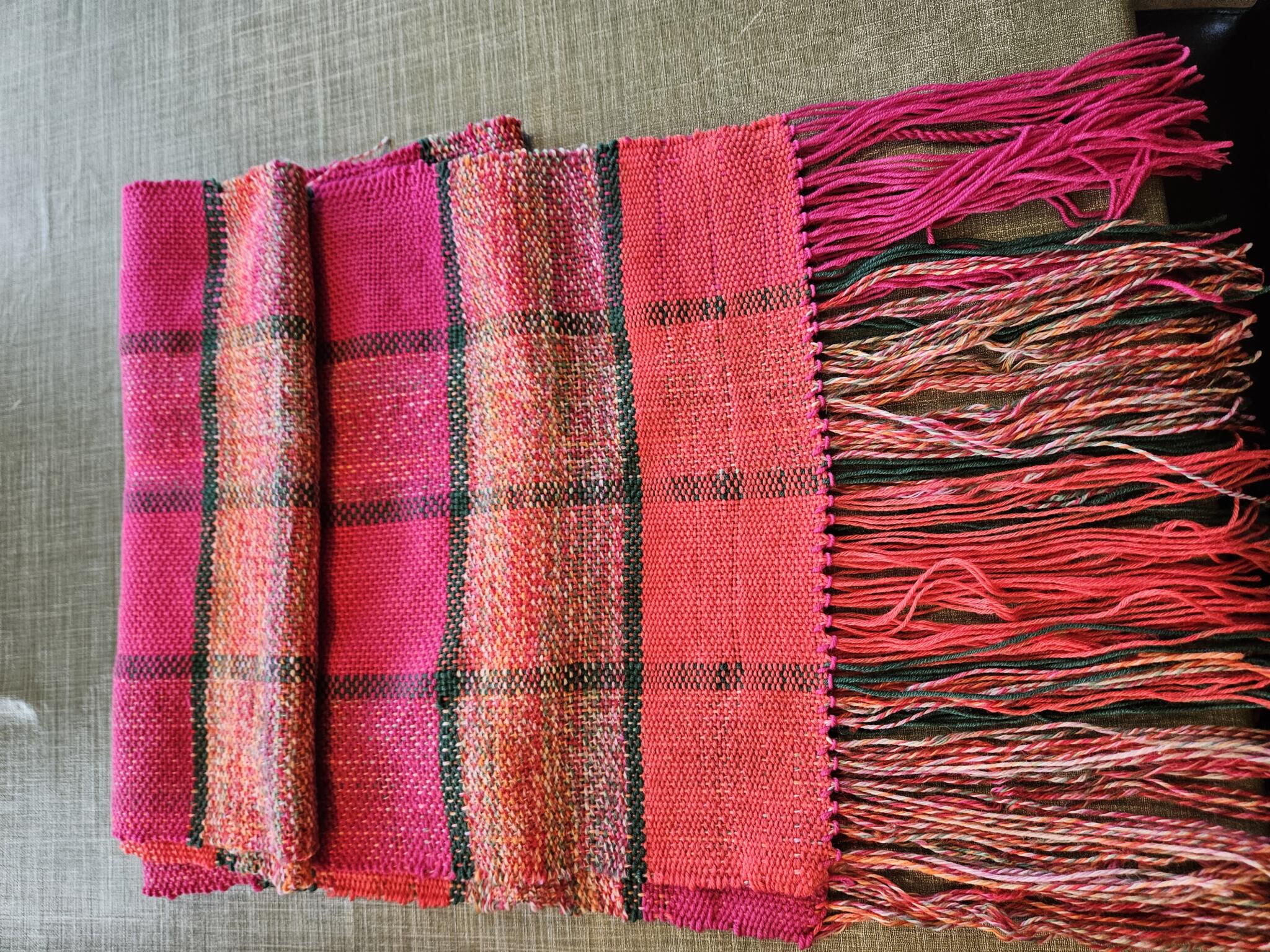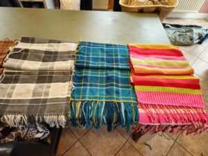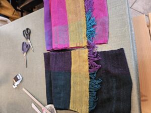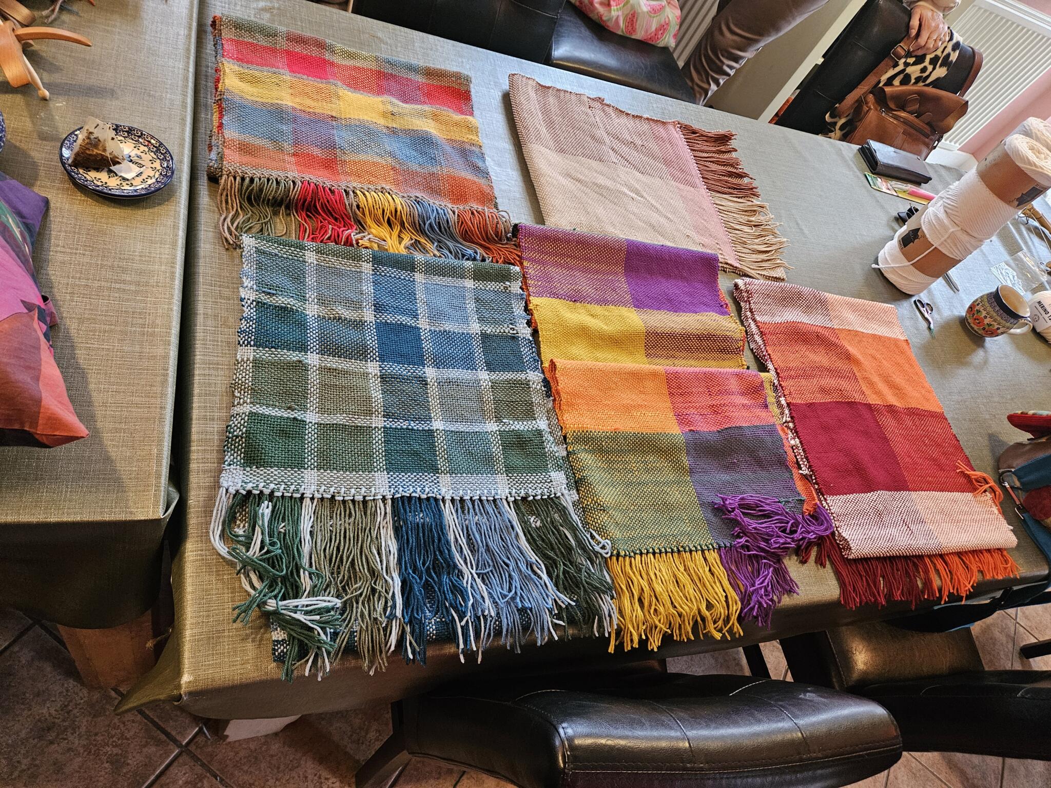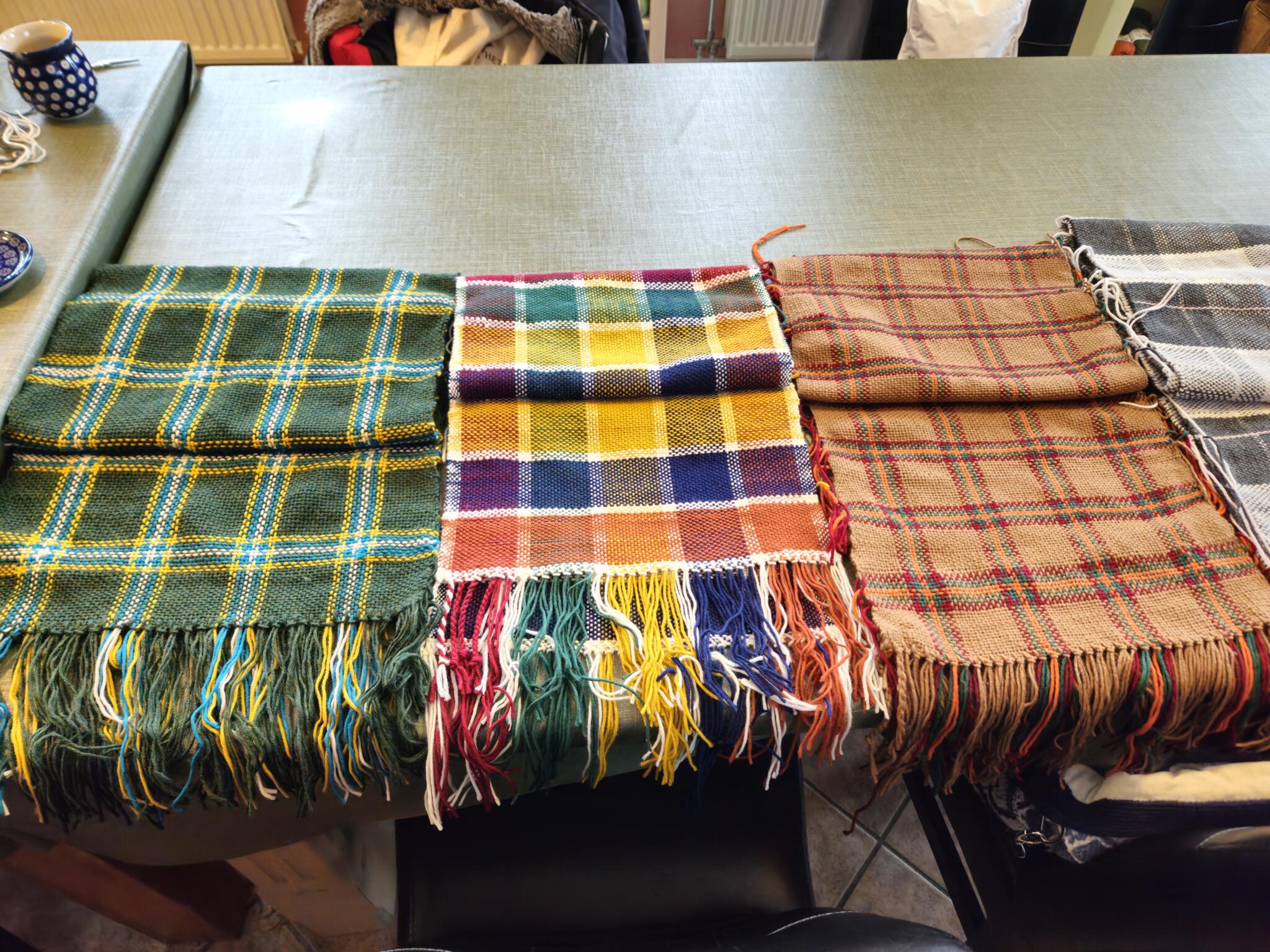 Hier nog een paar foto’s van alle sjaals die op de cursussen zijn geweven. Allemaal weer verschillend, dat maakt m’n werk ook zo leuk.