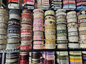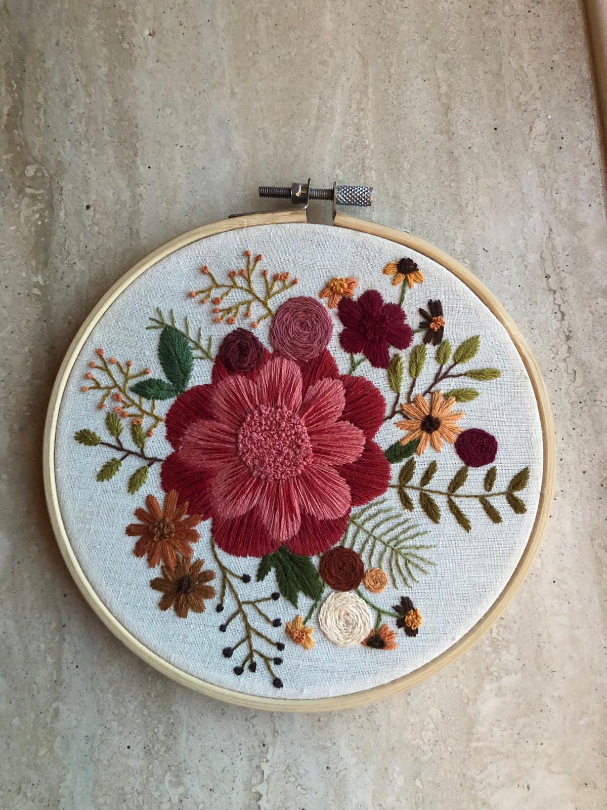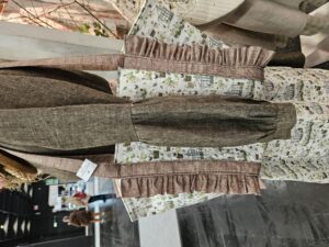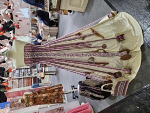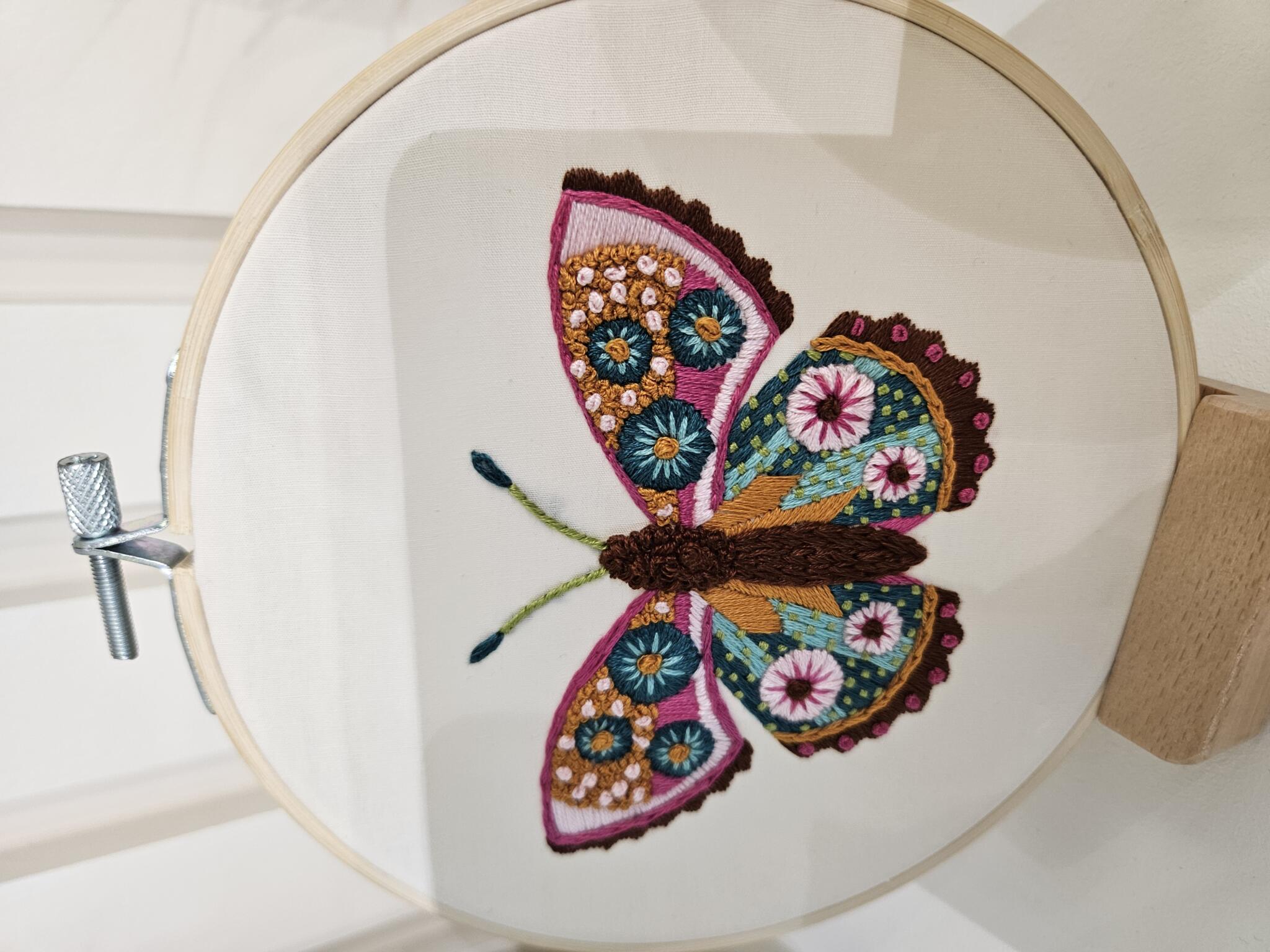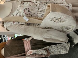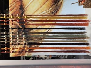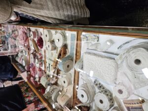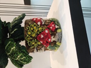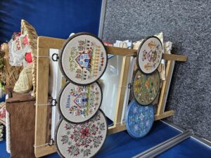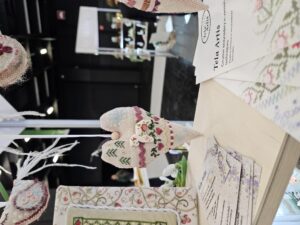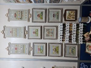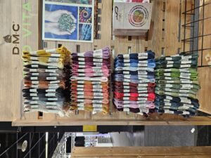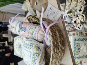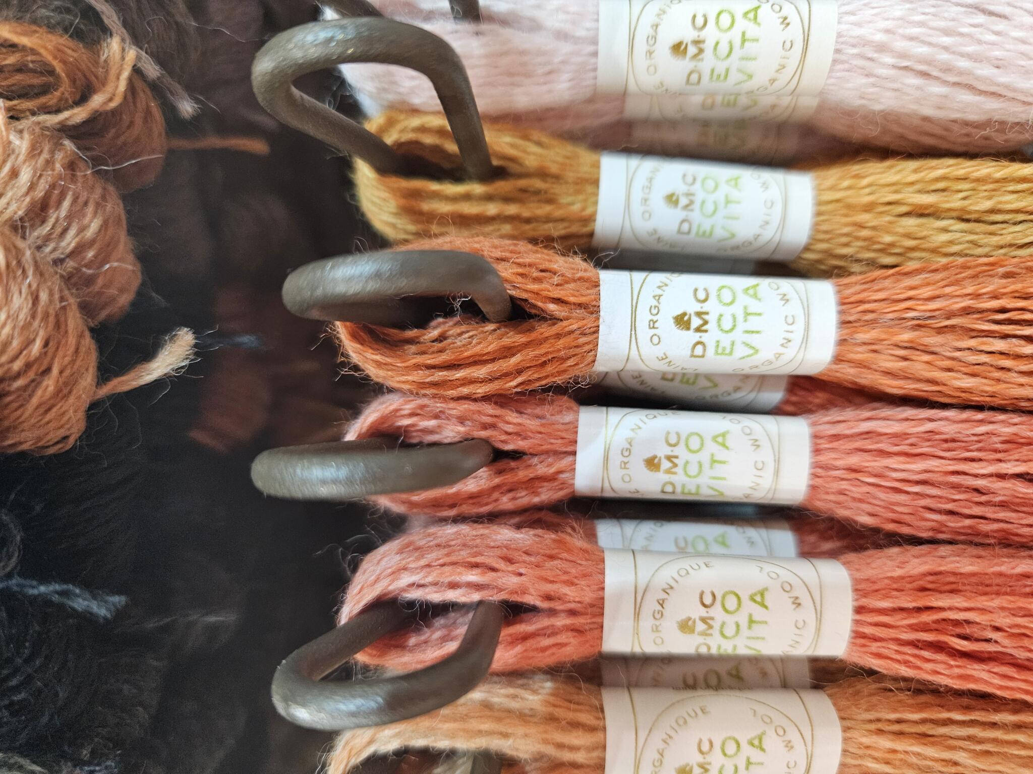 Ook het vrij borduren zag je daar veel. Dat zijn geen kruissteekjes maar allemaal verschillende steken. Heel mooi voor op een trui, jasje, gympen, tassen. En daar kwamen we ook het DMC borduurgaren tegen. Geen DMC borduurzijde maar van echt wol. En het bijzondere daar aan is dat het met planten geverfd is . Dus geen chemische troep erin Dat is zulk mooi borduurgaren. Daar hoefde ik niet over te twijfelen. Die komt wel in de winkel. Het is er in 60 kleuren en heb nu eerst een proefpakketje besteld, levertijd 3 weken. Moet uit Engeland komen.