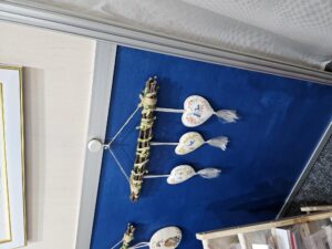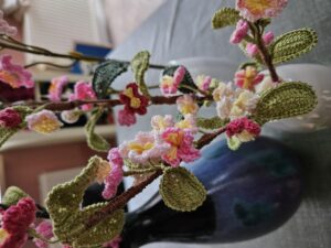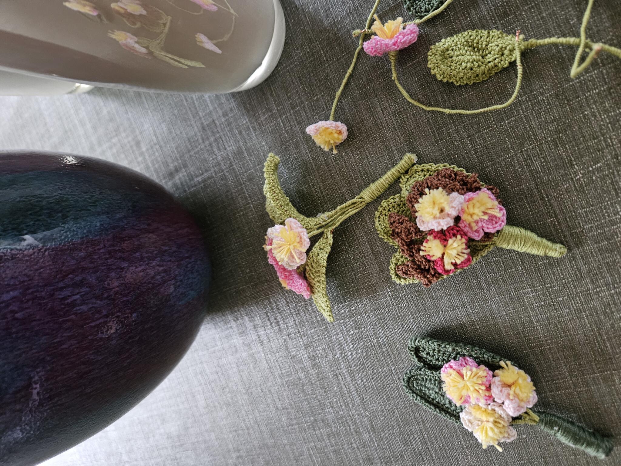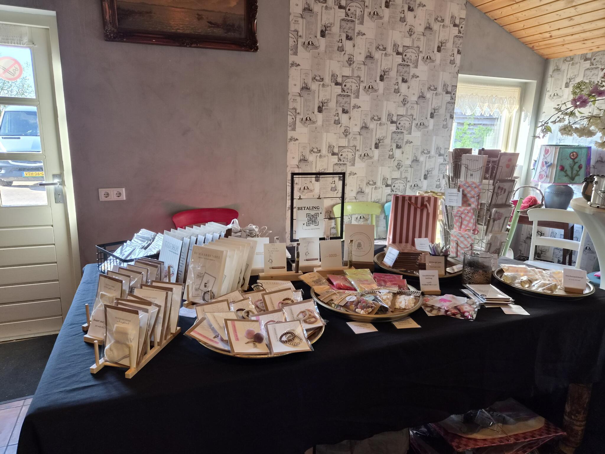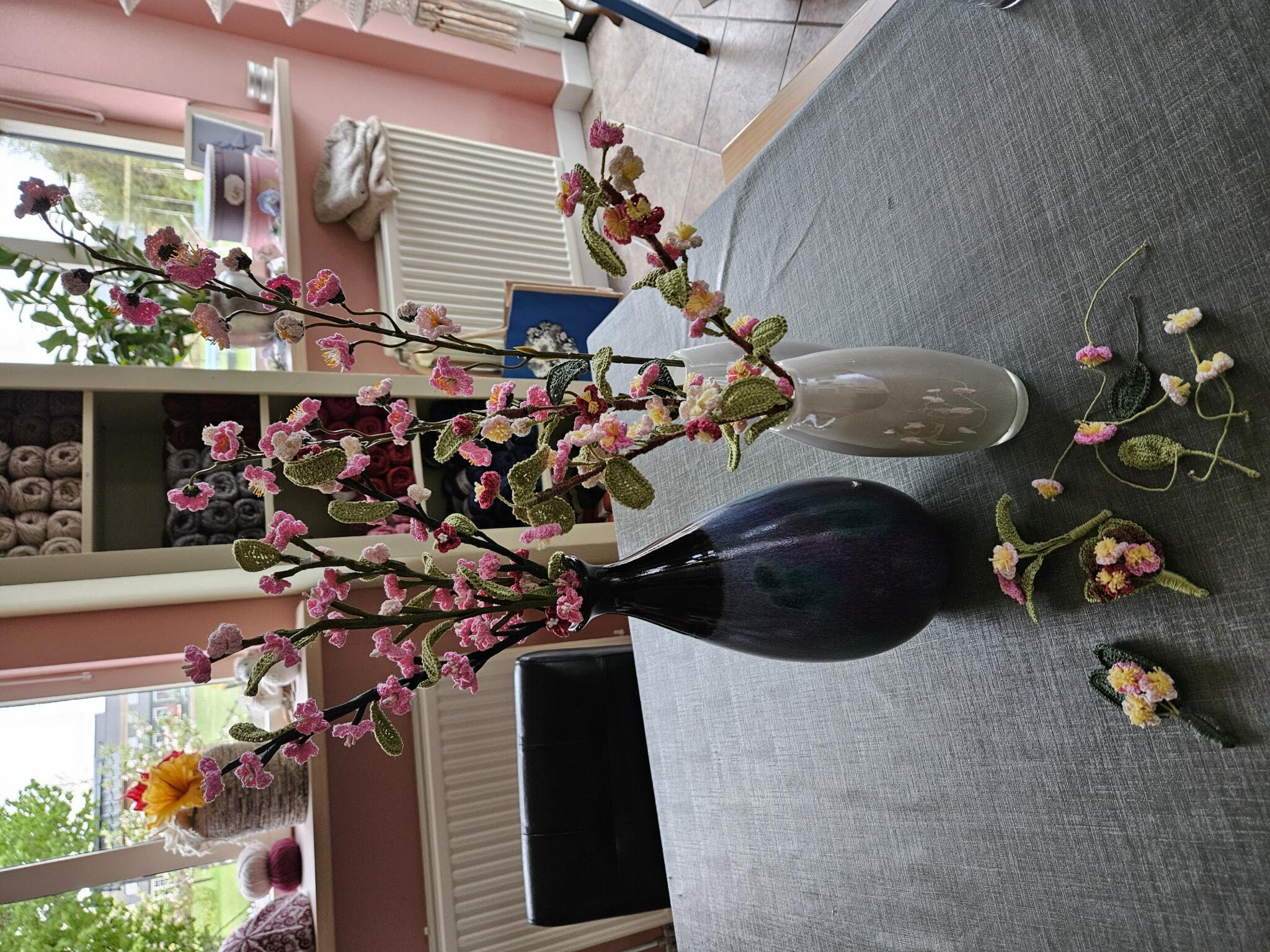 En Fien haakte prachtige takken met bloemen van Durable katoen( komt nieuw in de winkel) op haaknaald nr 1. Staat ook zo mooi. En wat een gepriegel. Daar is ze ook wel even zoet mee geweest. En zo wordt het steeds gezelliger in de winkel. Moet soms wel oppassen dat het niet teveel wordt want alles moet natuurlijk een plekje krijgen.