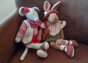 De haaksters voor de winkel hebben toch wat leuks gemaakt. Frieda haakte een konijn met kleding en de muis had ik al gehaakt maar nog geen tijd gehad om aan te kleden. Die pakte ze er gelijk achteraan. Is het geen schattig stelletje geworden? Het is ook zo’n leuk boekje. er staat ook nog een hert in in die kleuren. Ze scoorde ergens nog een leuk bakje en zo zitten ze samen met wolletjes en patroonboekjes te showen.
