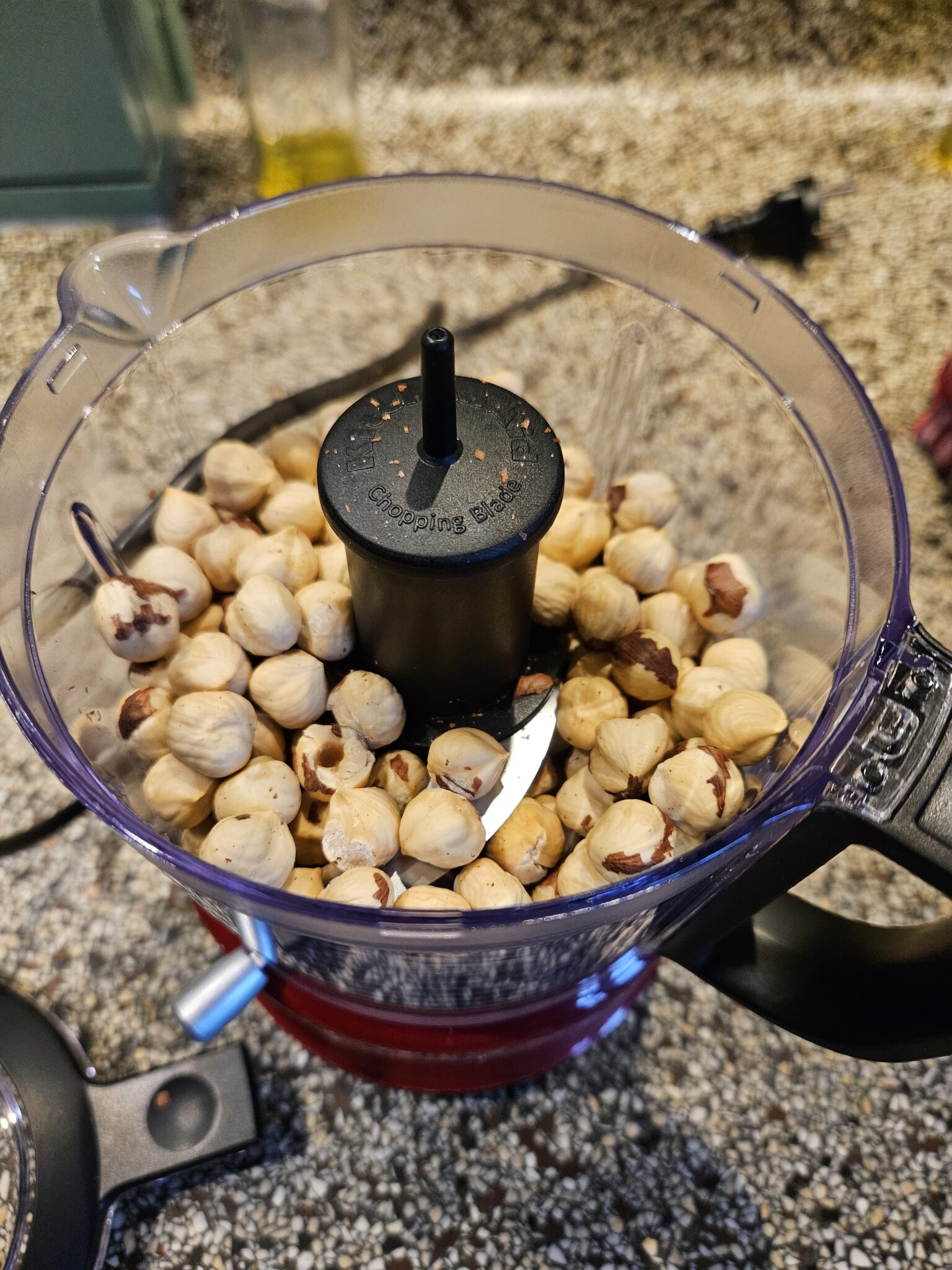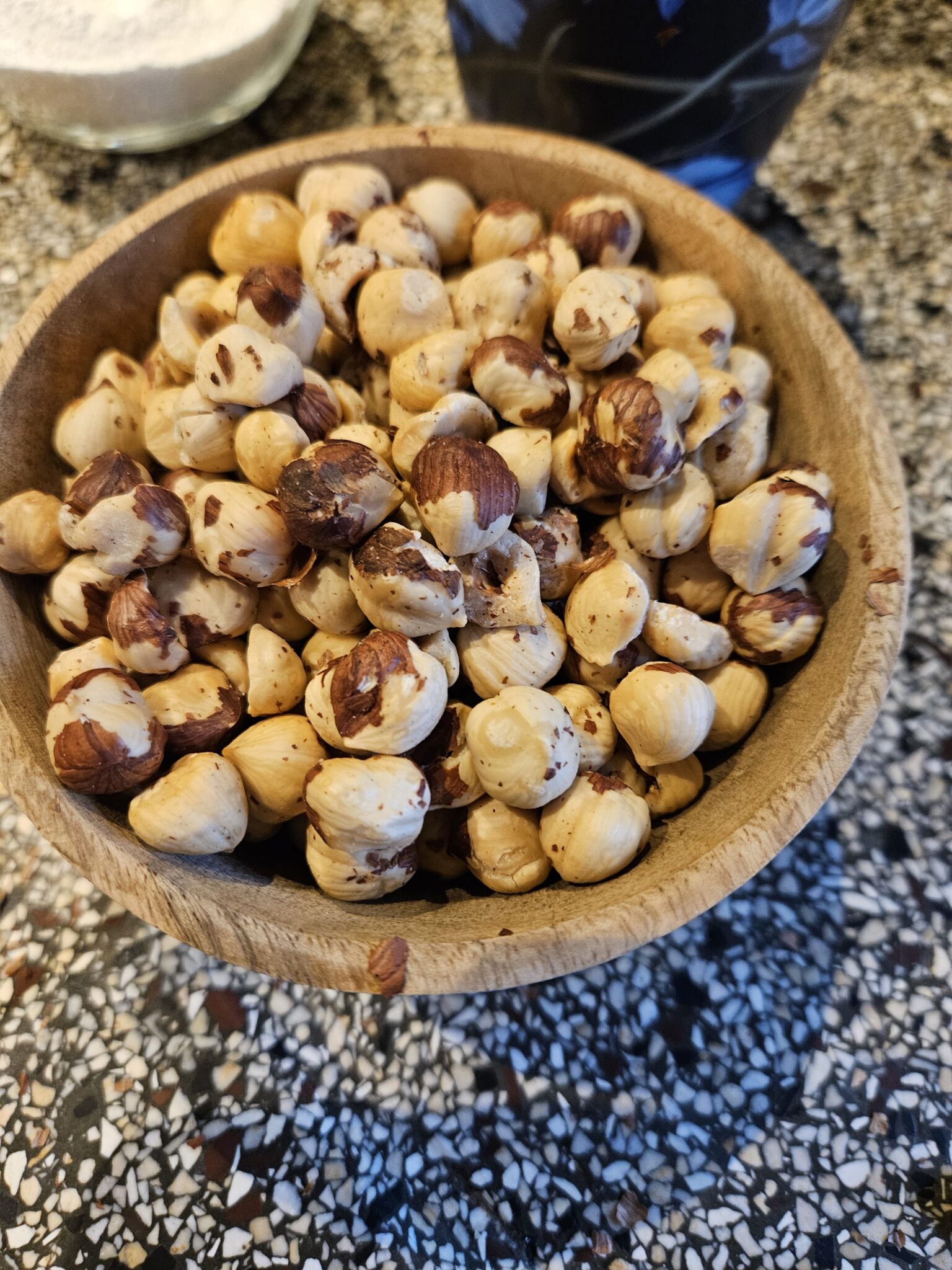 En ik heb er hazelnootpasta van gemaakt. Dat was echt leuk om te doen en zo simpel als wat. De hazelnoten moeten wel eerst geroosterd worden in de koekenpan of oven. Dan laat het bruine velletje los, rol je ze door een theedoek en het meeste is er dan af. Hazelnoten door het hakmolentje draaien, hazelnootolie, poedersuiker en cacao erbij, en smullen maar. Maakte een pot granola, daar gaan ook hazelnoten in. En dan kun je nog veel noten in allerlei baksels gebruiken. Ze zullen vast wel een keer opkomen. Nu ligt er nog wel 14 kilo hazelnoten als het al niet meer is. Nog wat te doen dus!