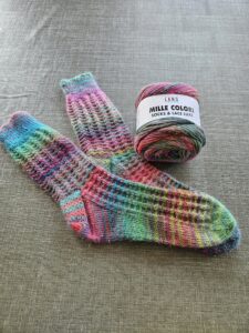 Deze sokken breide Ineke( geeft fair isle les) voor de winkel van Mille Colori. Een zacht kleurrijk sokkengaren met een glittertje. 12,95 een bol en daar haal je een paar sokken uit tot maat 45.