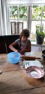 Die starten we op met de wasmachine vol stoppen(hoe kan het ook anders),troep van zondag opruimen en tuin schoffelen bij vakantiehuisje 4. Daar kwamen weer canadezen in en moest nog even afgemaakt worden met bloemen,chocolaatjes,en een derde bed wat opgemaakt moest worden. Al met al was het toen toch al weer elf uur en moest ik binnen weer verder. Mirjam ging uit school even noten kraken voor de hazelnoottaart,maar ik heb er voor dat recept 180 nodig. Verwacht je toch niet van een kind dat ze dat lang vol houdt. Maar Miep ging zitten met de deegroller en een plastic zak. Ze is een uur zoet geweest en kraakte er honderd,haha. Petje af voor Miepie. Elke noot die ze gekraakt had legde ze op de weegschaal en zette ze de ene noot op haar briefje erbij. Echt grappig om te zien. nu wil ze vanmiddag uit school de andere 80 doen,ben benieuwd. Na het eten zat ze nog heerlijk met het schaap en de hond te kroelen, vind het altijd mooi om te zien hoe gek kinderen met dieren kunnen zijn.