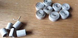 En maakte rolletjes kant,ook van oud papier. Je rolt en paar stroken papier tot een rolletje op,beetje lijm aan het uiteinde. Dan knip je een paar rondjes uit voor de boven en onderkant. Kleur je met potlood in,beetje beits of goudverf erover en dan rol je een smal stukje kant er om heen,net echt. Ze zijn 1 cm hoog.