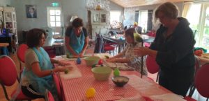 Bakte eerst scones,daarna walnotenboterkoek. Zette alles klaar voor de viltcursus. Er kwamen om half 10 4 vrouwen en een man voor een bloem vilten en daarna een high tea. De man was later omdat hij nachtdienst had gehad. Misschien hoopte hij wel dat we al klaar waren met het vilte,maar hij deed toch nog mee,echt leuk.Het was een gezellige groep. Het was de eerste man die ik op viltcursus had,dus mannen,schroom niet. De eerste heeft de spits afgebeten en het is hem nog gelukt ook?