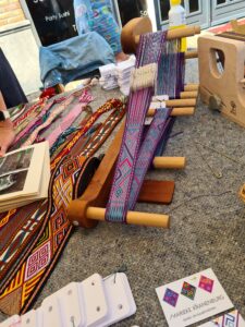 Woensdag ben ik met een medeweefster naar de weversmarkt in Hoorn geweest. Dat is hier vandaan anderhalf uur rijden. Daar zag ik dan weer tegenop maar het viel wel mee. Voor we het wisten waren we er. Lekker vroeg opgestaan zodat alles aan de kant was voor dat ik ging. Rien bleef een dag thuis van z’n werk om bij de kinderen te blijven. De bloemen die buiten in potten en bakken staan, overvloedig water gegeven. Om half negen werd ik opgehaald en om kwart over 4 waren we weer thuis. Totaal gesloopt?! Maar wat een markt zeg. Groot en heel veel mooie materialen. Alles op het gebied van weven, spinnen, quilten. Met ieder z’n eigen stempel op z’n werk, echt heel mooi! Heb een hoop inspiratie opgedaan. Moest me eigen wel inhouden want je ziet zoveel mooie wol, wordt je echt hebberig van.